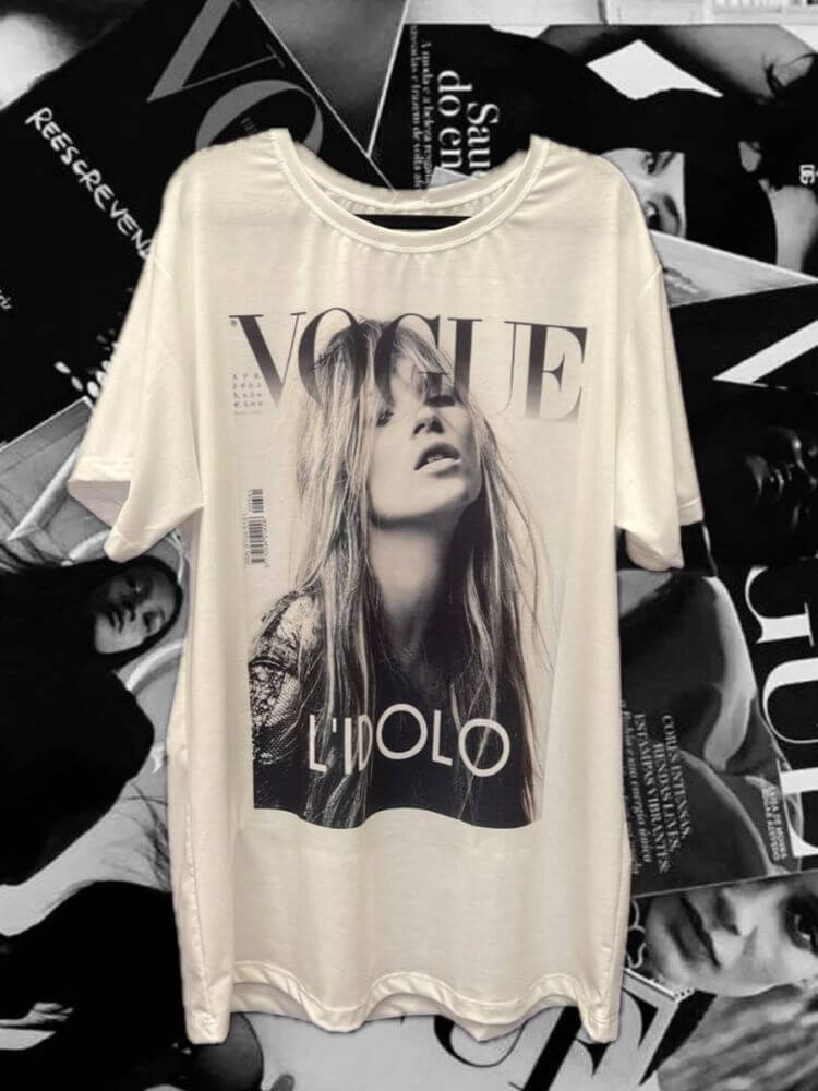 Detalhes: Maxi T-shirt manga curta Cor off white Gola redonda Manga curta Estampa de modelo na capa da revista Vogue Sem fechamento
