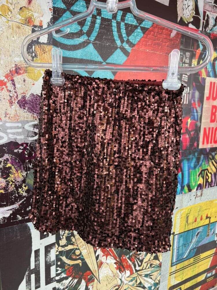 Detalhes: Saia curta Paetês marrom Elástico na cintura Forro