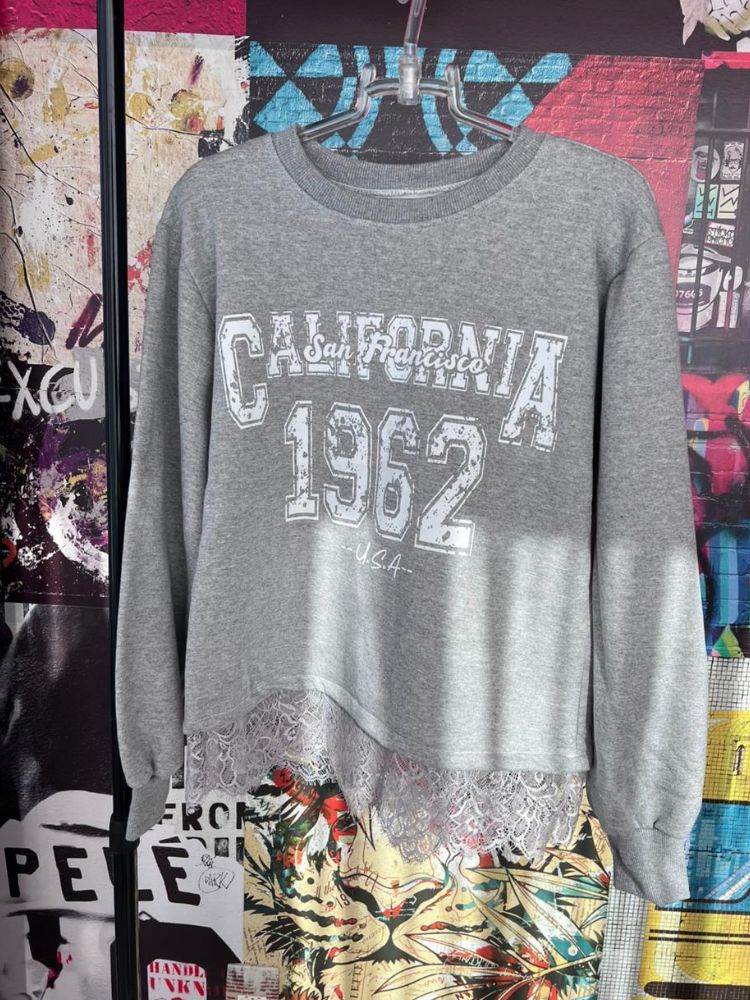Detalhes: Blusa moletom Cor cinza Escrita Califórnia Manga longa Detalhe de renda na barra Sem fechamento