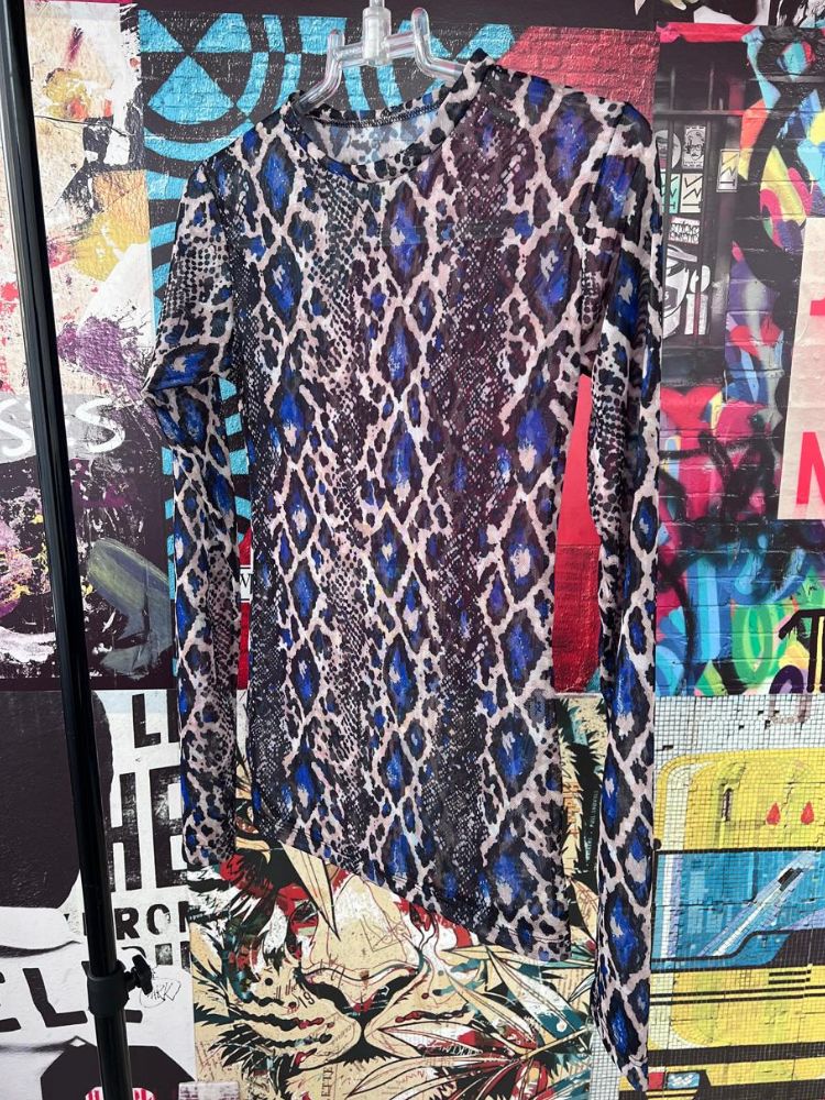 Detalhes: Blusa de tule transparente Estampa cobra em tom azul Manga longa Sem fechamento