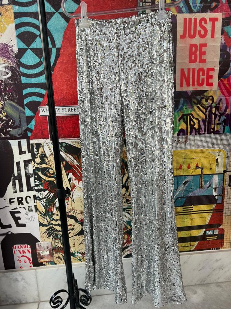 Detalhes: Calça Cor prata Tecido bordado com paetês