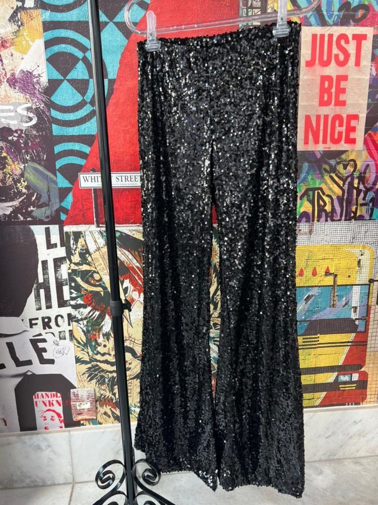 Detalhes: Calça Cor preta Tecido bordado com paetês