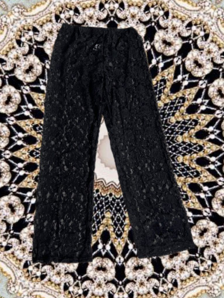 Composição: 90% Poliéster 10% Elastano Detalhes: Calça renda Cor preta Cintura de elástico Sem fechamento