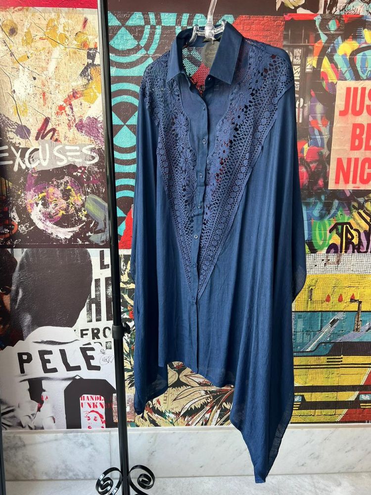 Detalhes: Camisa/saída de praia/Kimono Cor azul Detalhe de renda em recorte V na parte frontal e costas Fechamento por botões