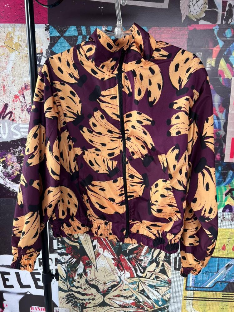 Detalhes: Casaco Modelo corta vento Estampa corrida detalhado por fundo roxo com bananas Elástico nos punhos e barra Fechamento por zíper