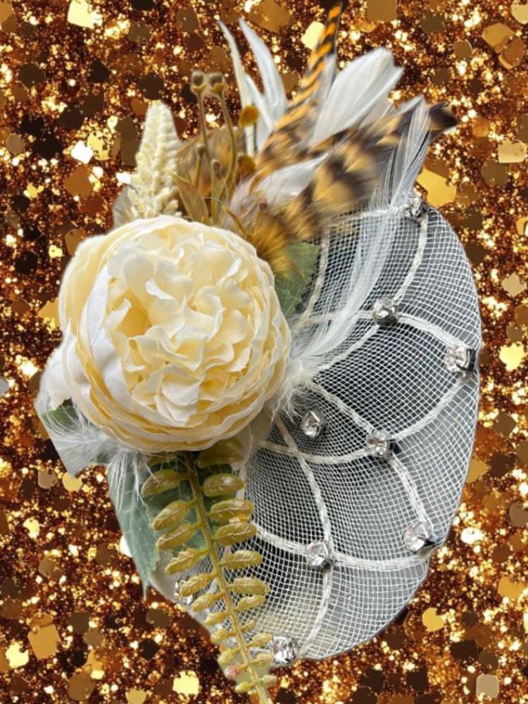 Detalhes: Casquete Cor off white Detalhado por flor, plumas e tule Presilha do tipo bico de pato Pode ser usado como ombreira, broche e presilha