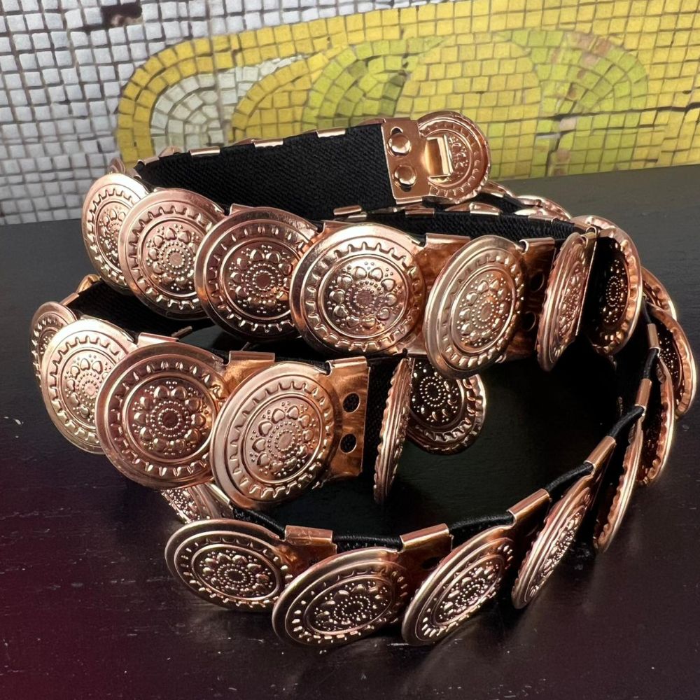 Detalhes: Cinto com base de elástico Medalhas douradas texturizadas em sequência Fecho do tipo encaixe