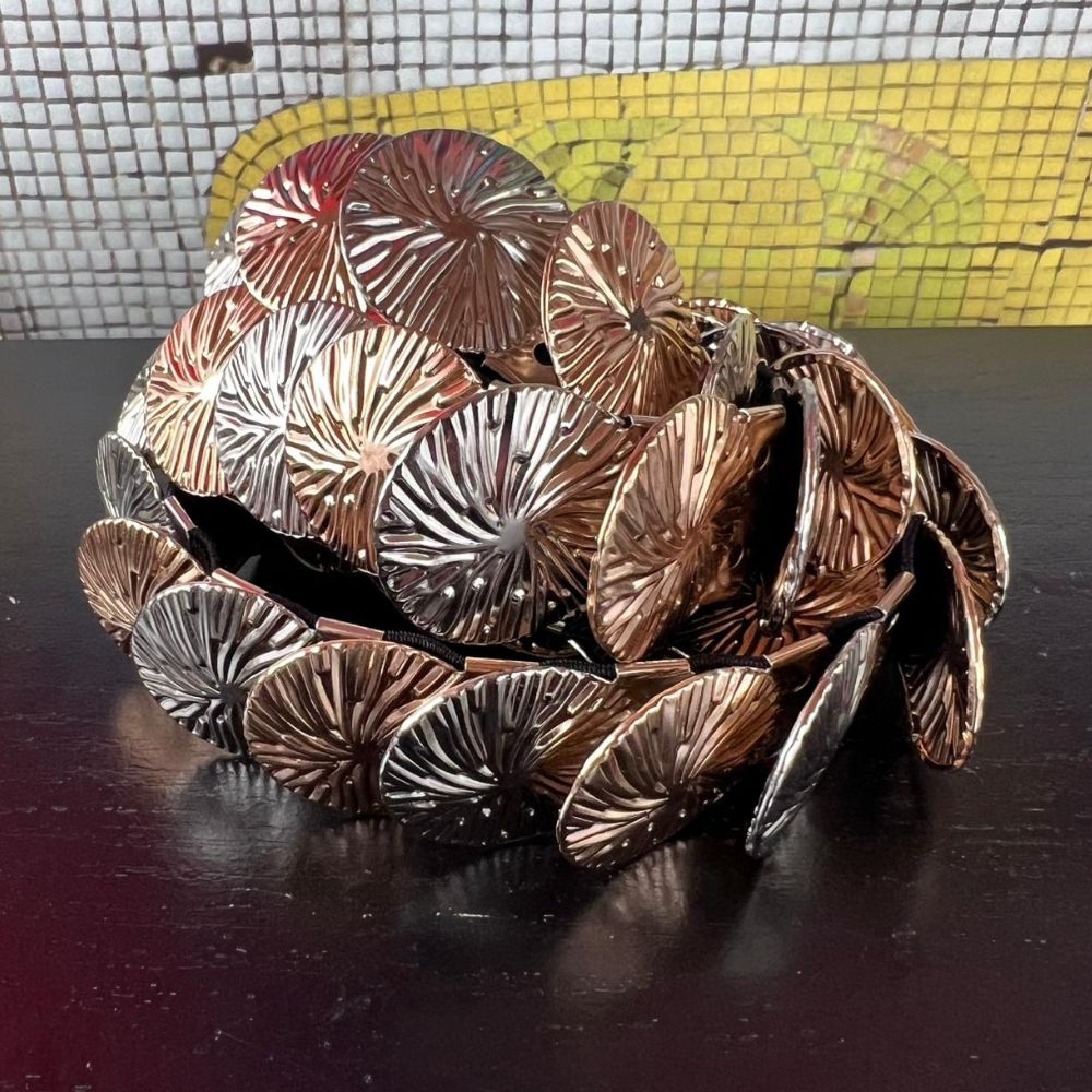 Detalhes: Cinto com base de elástico Medalhas prateadas e douradas texturizadas em sequência Fecho do tipo encaixe