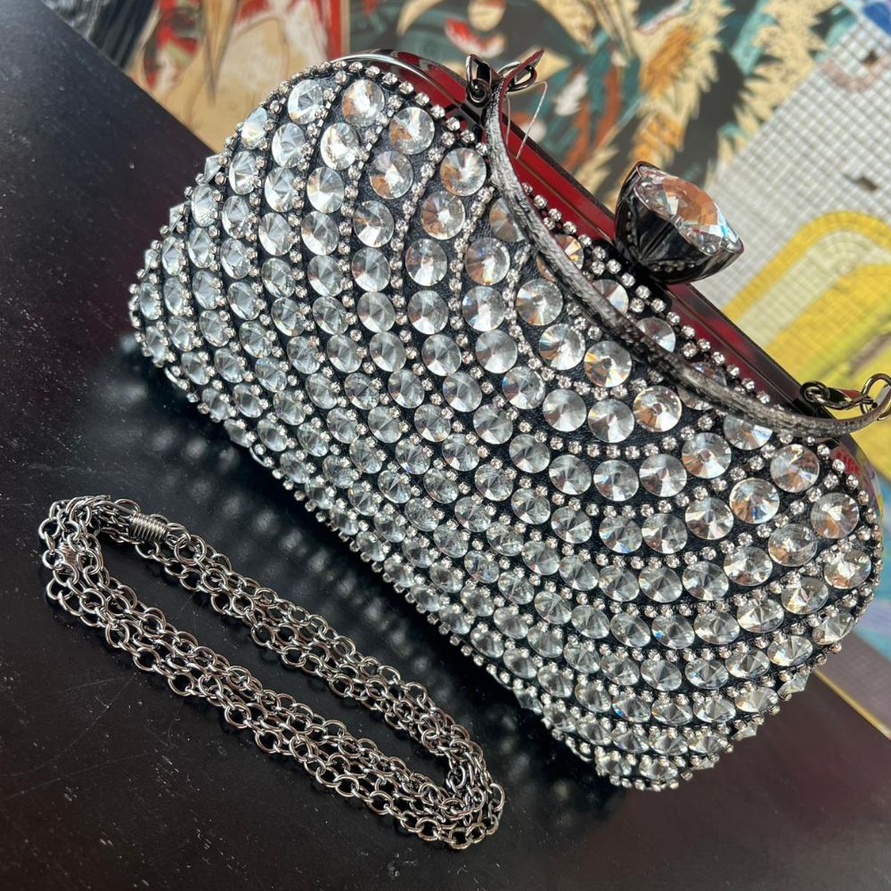 Detalhes: Bolsa do tipo clutch rígida Cor base preto Formato retangular Strass branco Duas opções de alça removível