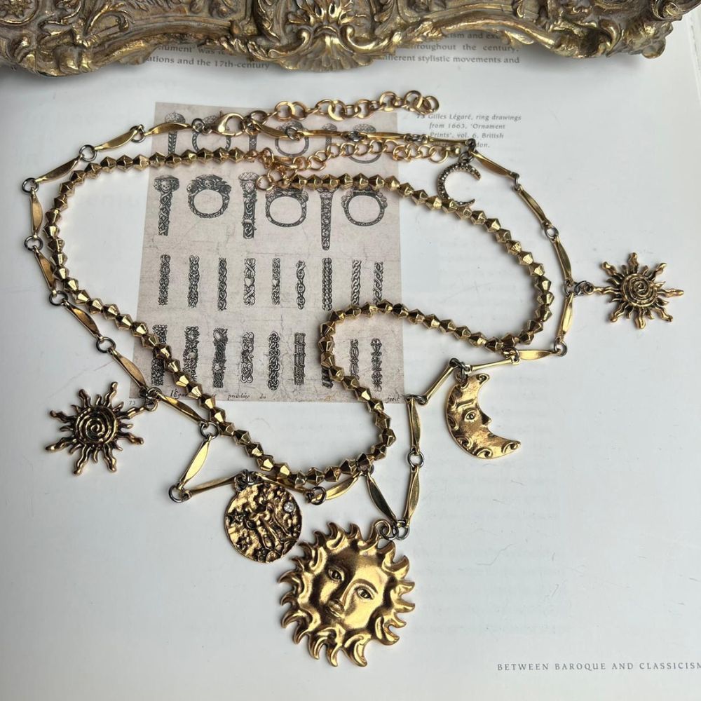 Detalhado por pingentes de sol e lua ao longo de uma das correntes