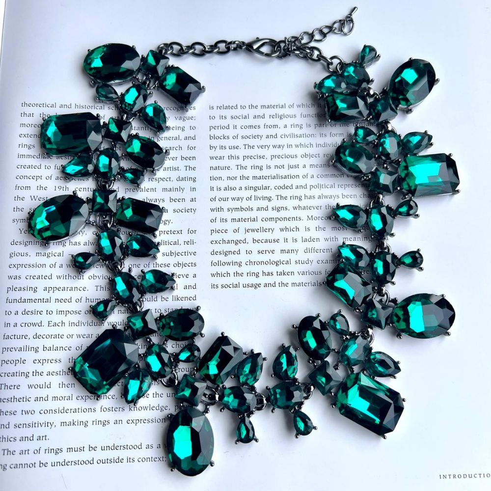 Estilo riviera com pedras chaton em diversos formatos na cor esmeralda