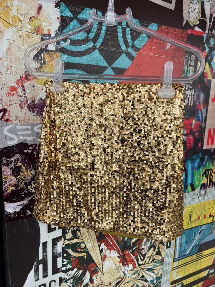 Detalhes: Saia curta Paetês dourada Elástico na cintura Forro