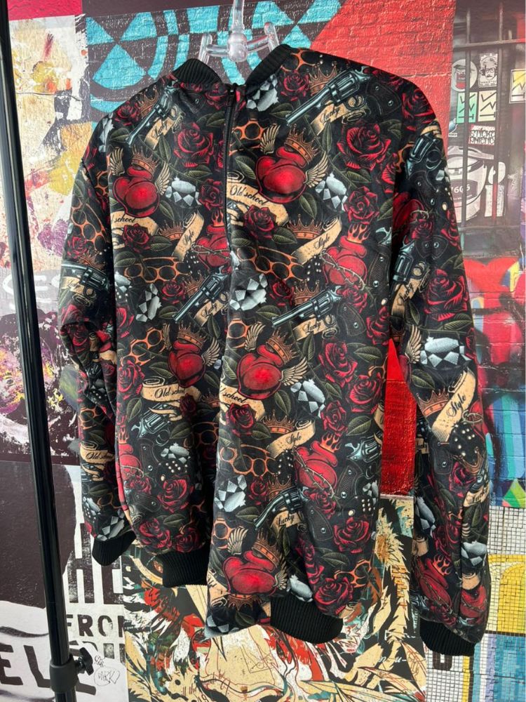 Detalhes: Jaqueta manga longa suede Modelagem dupla face De um lado estampa com flores e coração do outro desenhos de romã. Fechamento por zíper