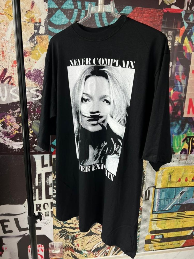 Detalhes: Maxi t-shirt preta Manga curta Gola redonda Estampa localizada na parte frontal Desenho de uma mulher com escrita: Never complain Sem fechamento