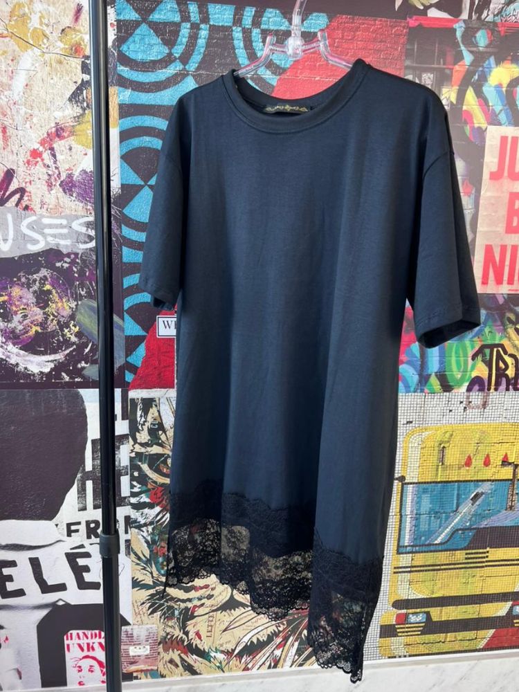 Detalhes: Maxi t-shirt Cor preta Manga curta Gola redonda Detalhe de renda na barra Sem fechamento