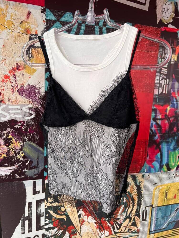Detalhes: Regata malha off white Recorte Nadador Regata renda preta Regulagem nas alças