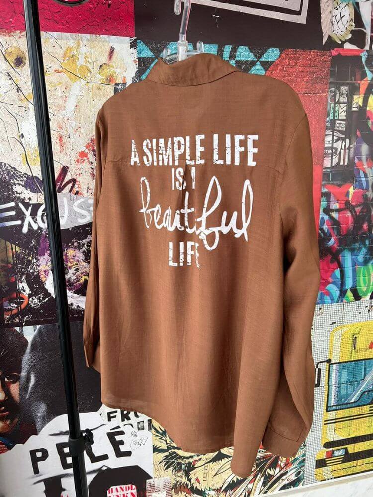 Detalhes: Camisa manga longa Viscose e poliéster Cor marrom Fechamento por botões Escrita nas costas: A simple life is a beautiful life