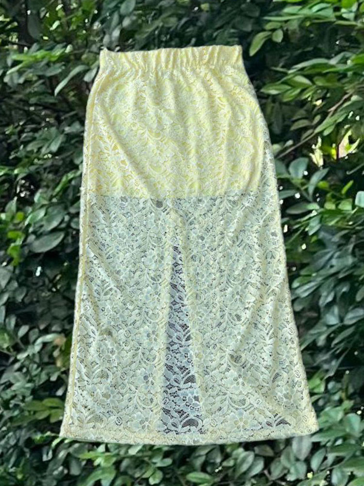 Detalhes: Saia midi Tecido renda Cor amarelo Forro por baixo mais curto Elástico na cintura