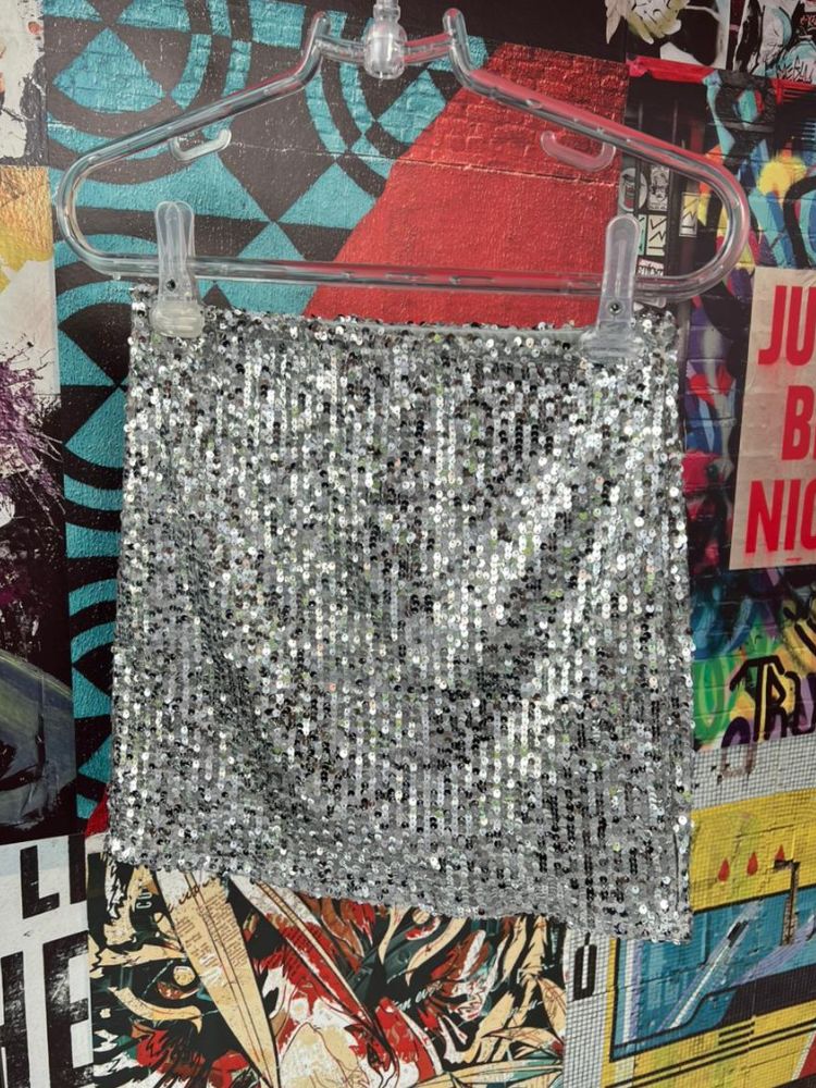 Detalhes: Saia curta Paetês prata Elástico na cintura Forro