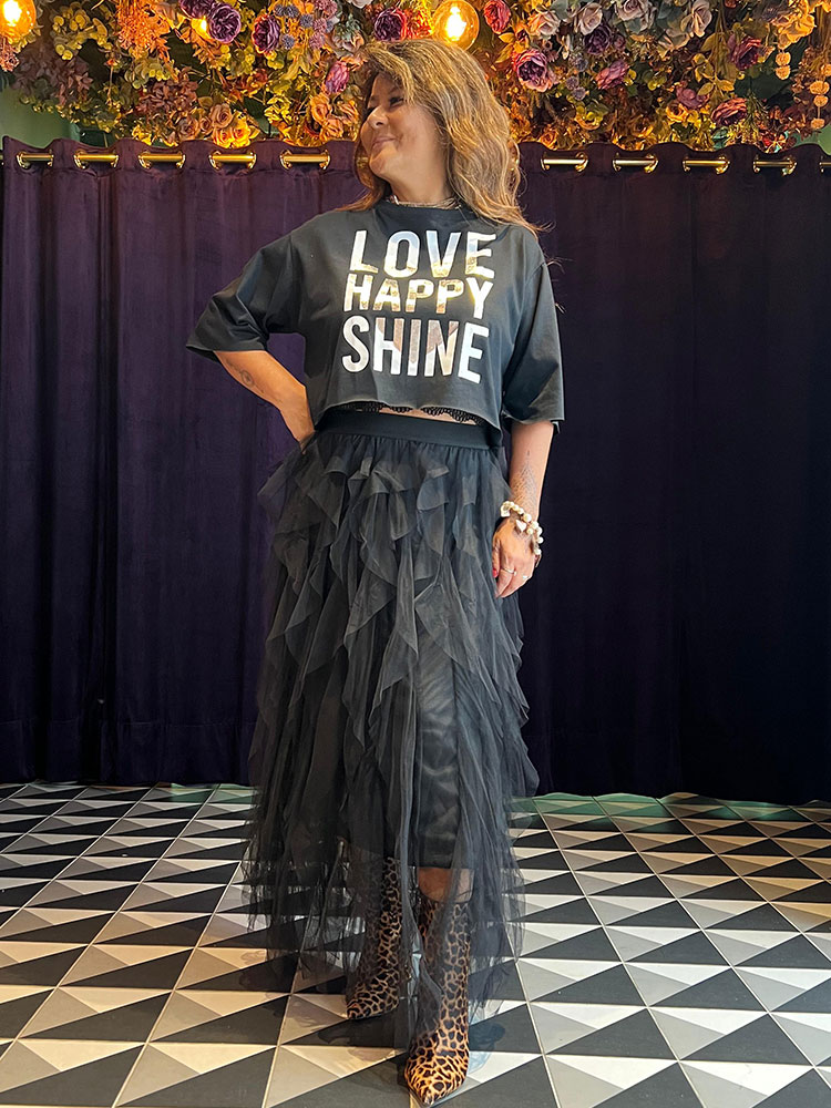 Detalhes: Saia longa de tule Camadas Cor preto Com forro Cintura com elástico