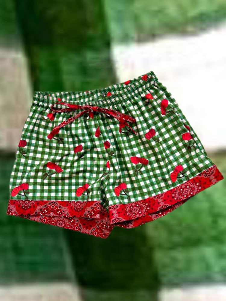Estampa quadriculado verde com desenho de acerolas