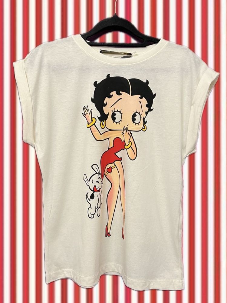Detalhes: T-shirt manga curta dobrada (manga japonesa) Cor off white Gola redonda Estampa localizada na parte frontal Desenho da Betty Boop Sem fechamento