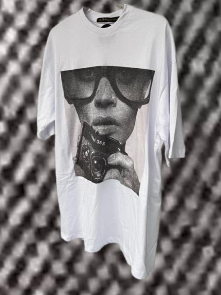 Detalhes: T-shirt branca Manga curta Estampa localizada na parte frontal Desenho de uma mulher com câmera fotográfica Sem fechamento