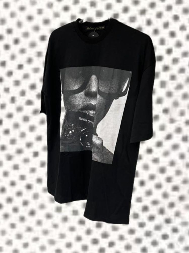 Detalhes: T-shirt preta Manga curta Estampa localizada na parte frontal Desenho de uma mulher com câmera fotográfica Sem fechamento