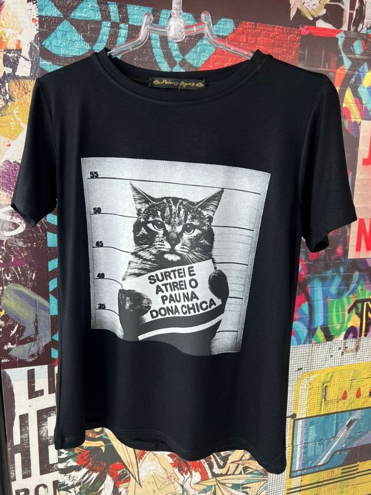 Estampa gato preto com escrita "surtei e atirei o pau na dona chica"