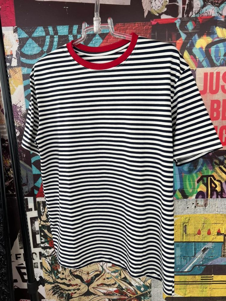 Detalhes: T-shirt Gola redonda vermelha Estampa listras brancas e azul marinho Manga curta Sem fechamento