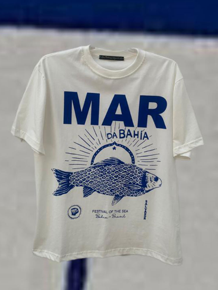 Desenho de peixe com escrita (Mar da Bahia) em azul