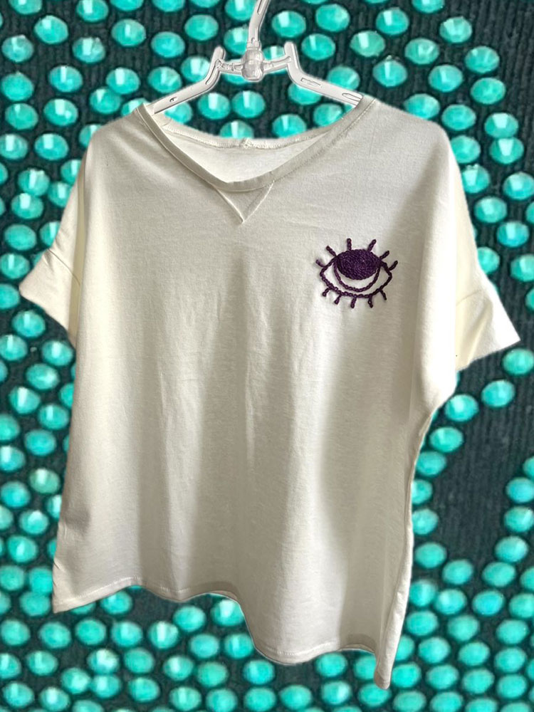 Detalhes: T-shirt off white Manga curta Olho bordado roxo Sem fechamento Tamanho: Comprimento: 62cm Busto: 110cm