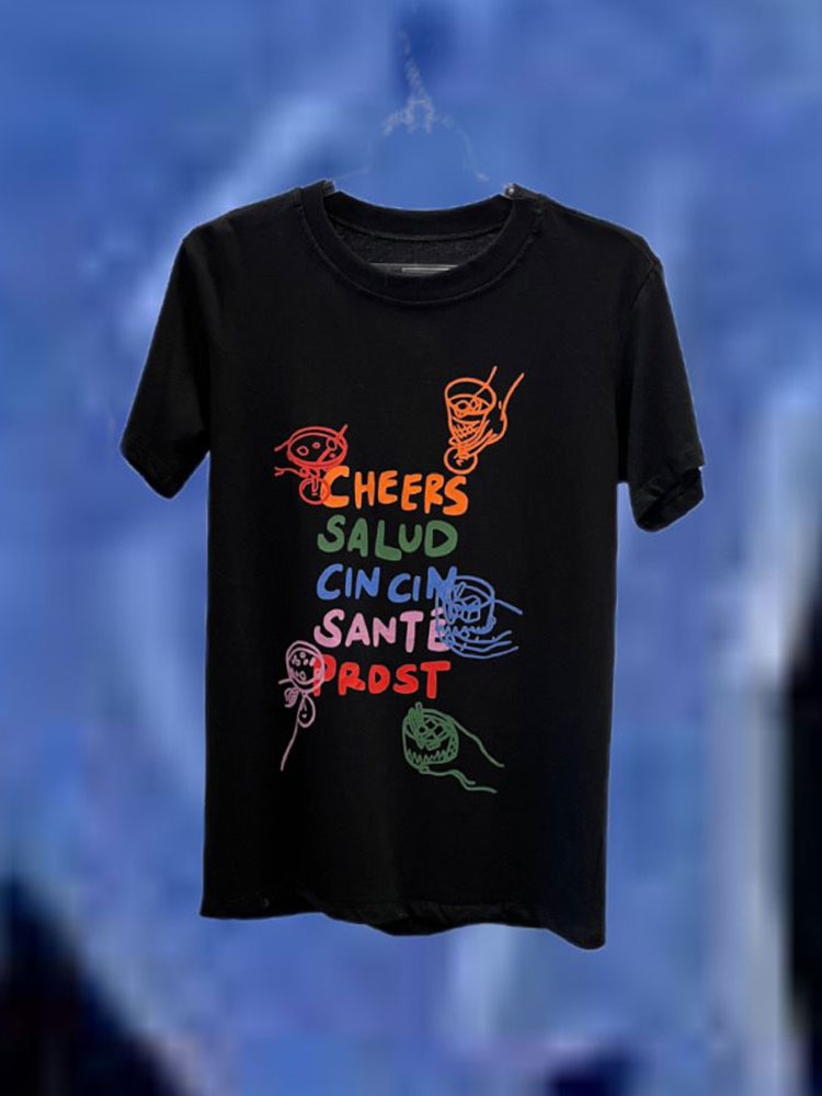 Detalhes: T-shirt preta Manga curta Gola redonda em punho Estampa localizada na parte frontal Escrita: Cheers, salud, cin cin, santé, prost Sem fechamento