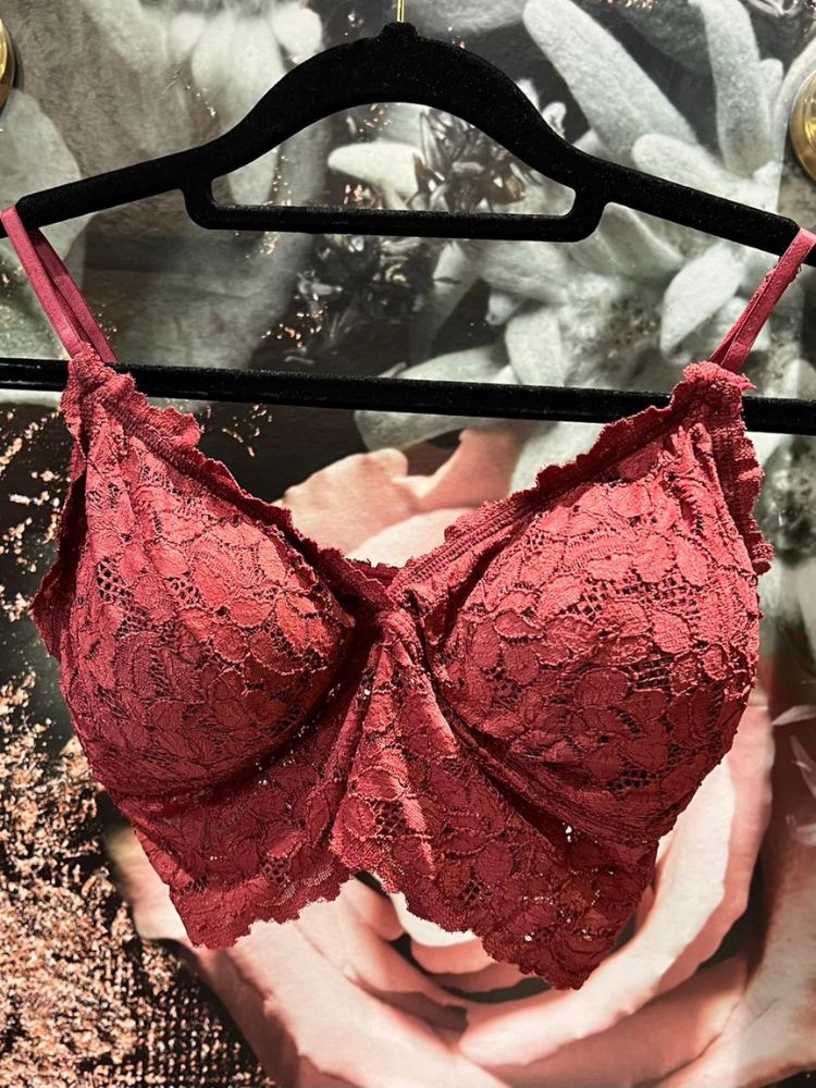 Detalhes: Top de renda vinho Com bojo Alças reguláveis Elástico Sem fecho