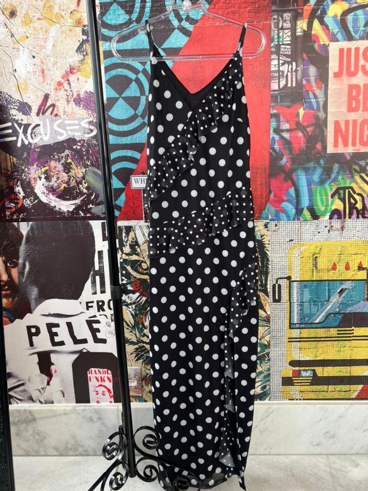 Detalhes: Vestido longo Alça Estampa bolinhas Detalhe de babados