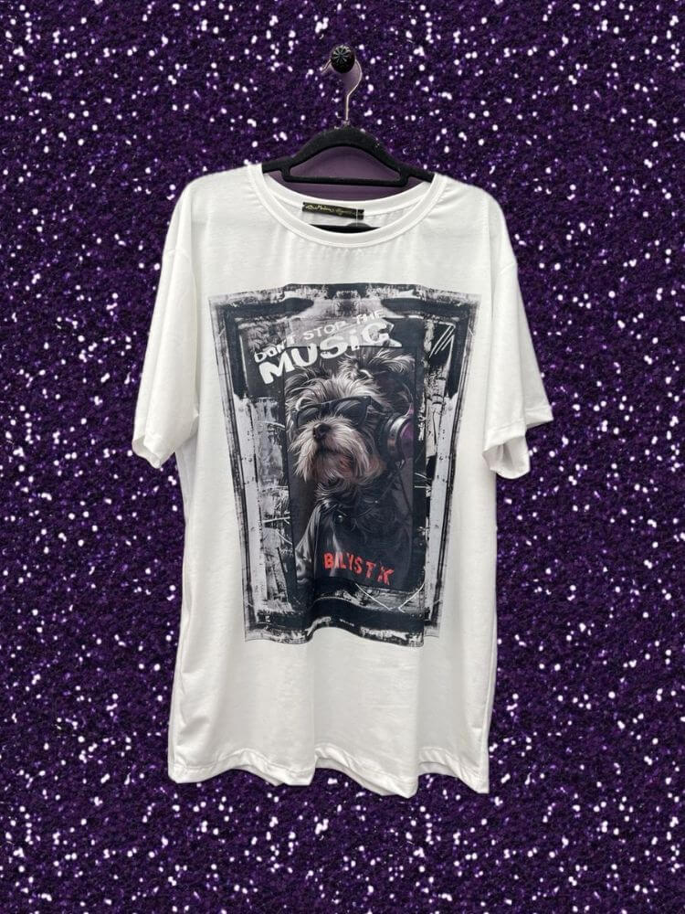 Detalhes: Maxi T-shirt manga curta Cor off white Gola redonda Manga curta Estampa de modelo na capa da revista Vogue Sem fechamento