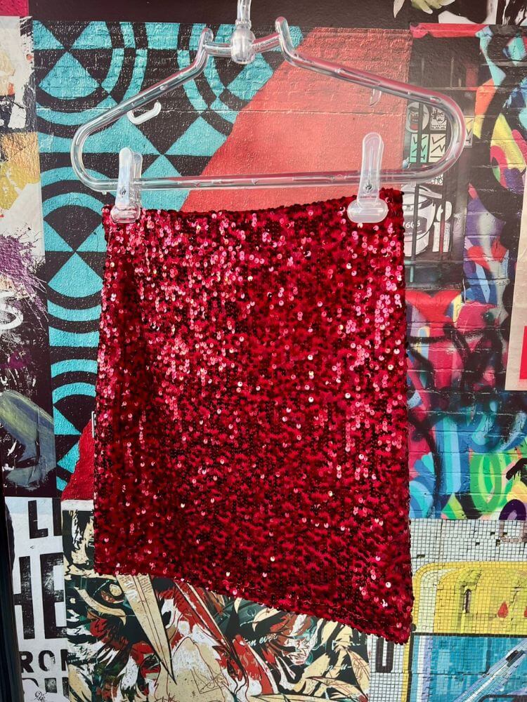 Detalhes: Saia curta Paetês vermelha Elástico na cintura Forro